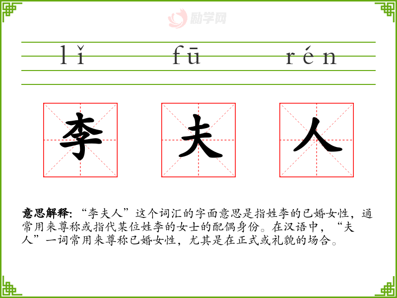 “李夫人”这个词汇的字面意思是指姓李的已婚女性,通常用来尊称或指代某位姓李的女士的配偶身份。在汉语中,“夫人”一词常用来尊称已婚女性,尤其是在正式或礼貌的场合。
