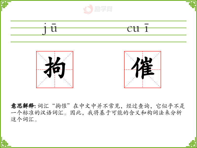 词汇“拘催”在中文中并不常见,经过查询,它似乎不是一个标准的汉语词汇。因此,我将基于可能的含义和构词法来分析这个词汇。
