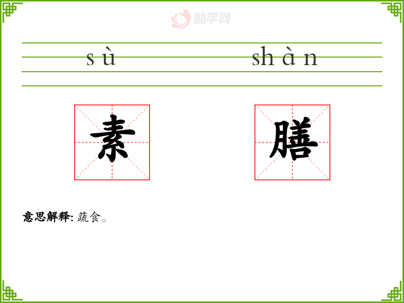 早膳;供给膳宿;膳部员外郎、 膳服、 膳羞、 膳饮