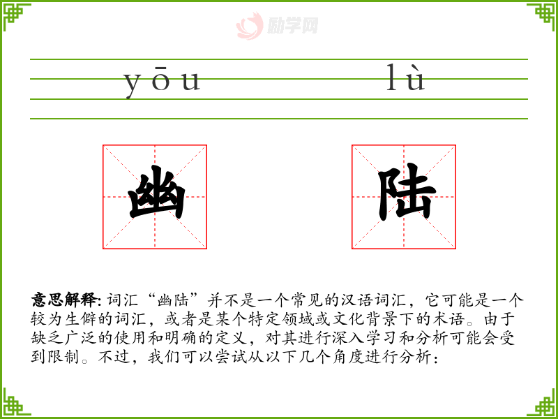 词汇“幽陆”并不是一个常见的汉语词汇,它可能是一个较为生僻的词汇,或者是某个特定领域或文化背景下的术语。由于缺乏广泛的使用和明确的定义,对其进行深入学习和分析可能会受到限制。不过,我们可以尝试从以下几个角度进行分析:
