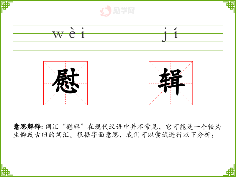 词汇“慰辑”在现代汉语中并不常见,它可能是一个较为生僻或古旧的词汇。根据字面意思,我们可以尝试进行以下分析: