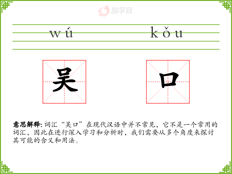 词汇“吴口”在现代汉语中并不常见,它不是一个常用的词汇,因此在进行深入学*和分析时,我们需要从多个角度来探讨其可能的含义和用法。