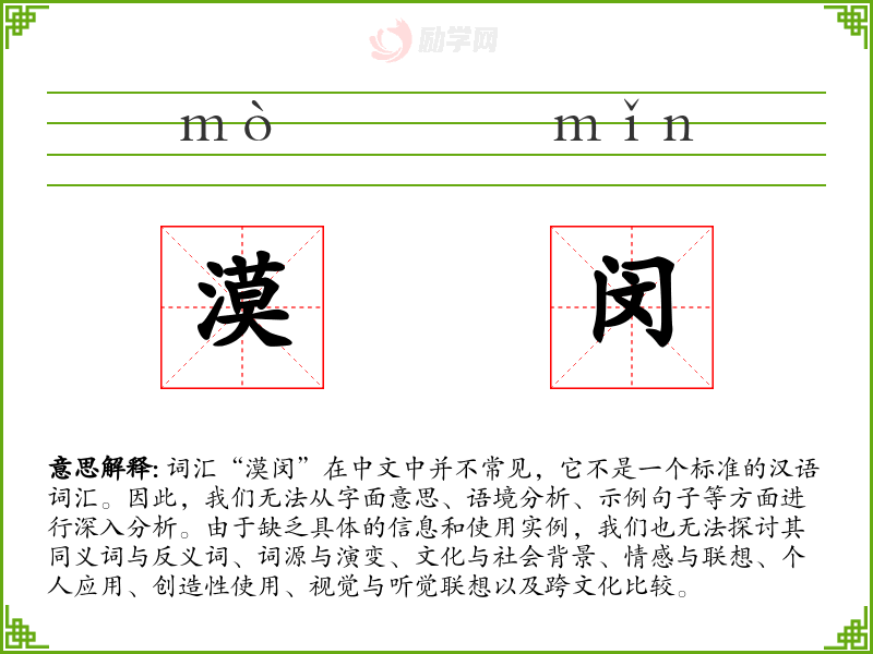 鉴于“漠闵”不是一个已知的词汇,我们可以推测它可能是由两个汉字“漠”和“闵”组合而成的。在这里,我们可以对这两个汉字进行简要的分析: