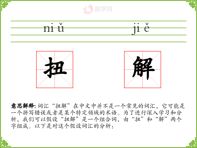 词汇“扭解”在中文中并不是一个常见的词汇,它可能是一个拼写错误或者是某个特定领域的术语。为了进行深入学习和分析,我们可以假设“扭解”是一个组合词,由“扭”和“解”两个字组成。以下是对这个假设词汇的分析: