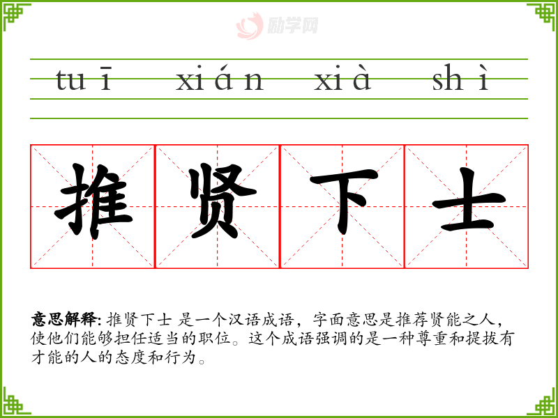 推贤下士 这个词汇不仅体现了对人才的尊重,也反映了公正和智慧的领导原则。在现代社会,这一原则对于构建高效和和谐的组织环境至关重要。通过学*和应用这个词汇,我更加认识到人才选拔和培养的重要性,以及如何在实际工作中践行这一原则。