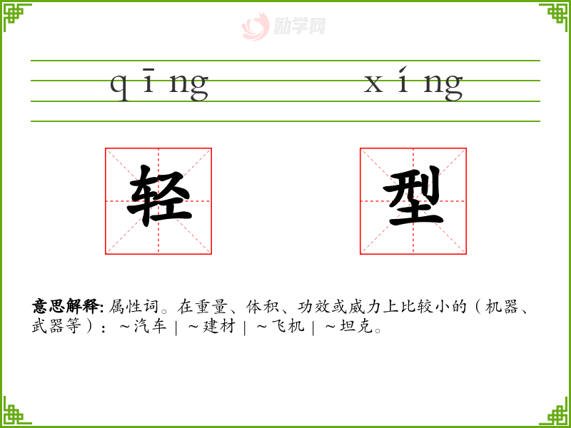 轻型的意思是:属性词。在重量、体积、功效或威力上比较小的(机器、武器等):~汽车|~建材|~飞机|~坦克。