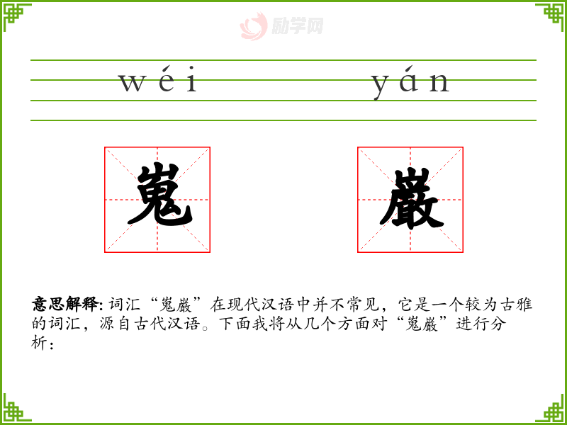 词汇“嵬巌”在现代汉语中并不常见,它是一个较为古雅的词汇,源自古代汉语。下面我将从几个方面对“嵬巌”进行分析: