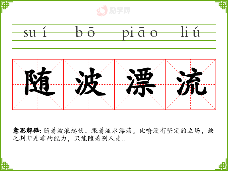 随着波浪起伏,跟着流水漂荡。比喻没有坚定的立场,缺乏判断是非的能力,只能随着别人走。
