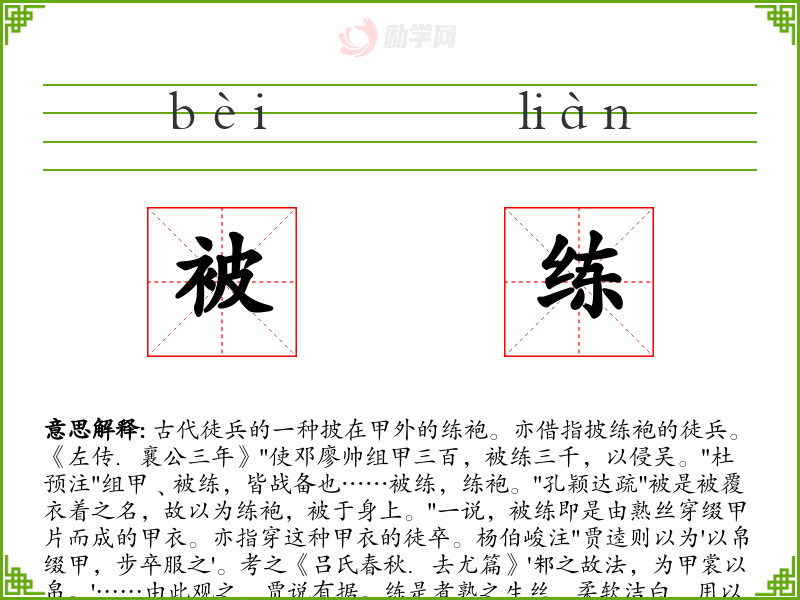 古代徒兵的一种披在甲外的练袍。亦借指披练袍的徒兵。《左传.襄公三年》"使邓廖帅组甲三百,被练三千,以侵吴。"杜预注"组甲﹑被练,皆战备也……被练,练袍。"孔颖达疏"被是被覆衣着之名,故以为练袍,被于身上。"一说,被练即是由熟丝穿缀甲片而成的甲衣。亦指穿这种甲衣的徒卒。杨伯峻注"贾逵则以为'以帛缀甲,步卒服之'。考之《吕氏春秋.去尤篇》'邾之故法,为甲裳以帛。'……由此观之,贾说有据。练是煮熟之生丝,柔软洁白,用以穿甲片成甲衣。"