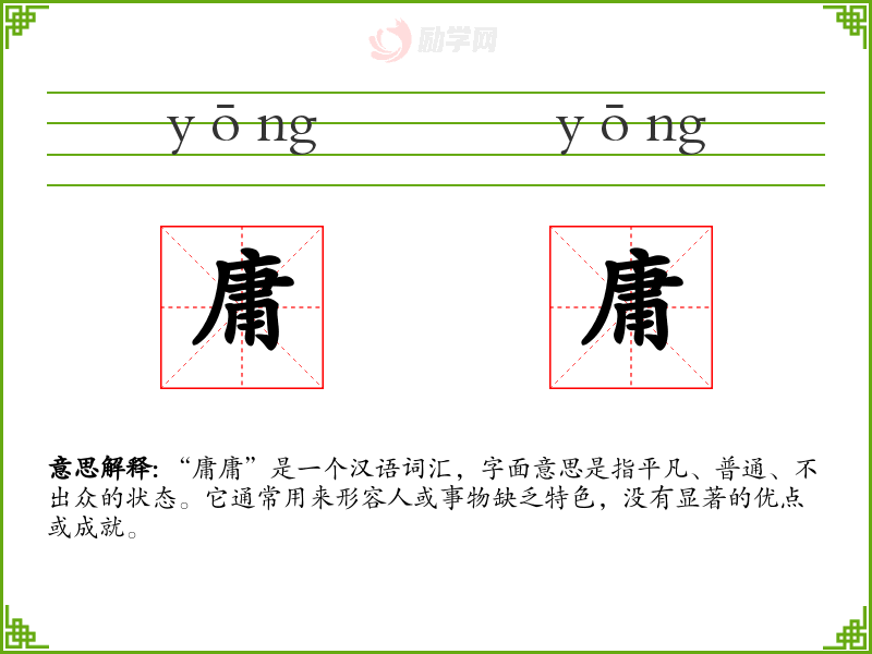 “庸庸”是一个汉语词汇,字面意思是指平凡、普通、不出众的状态。它通常用来形容人或事物缺乏特色,没有显著的优点或成就。
