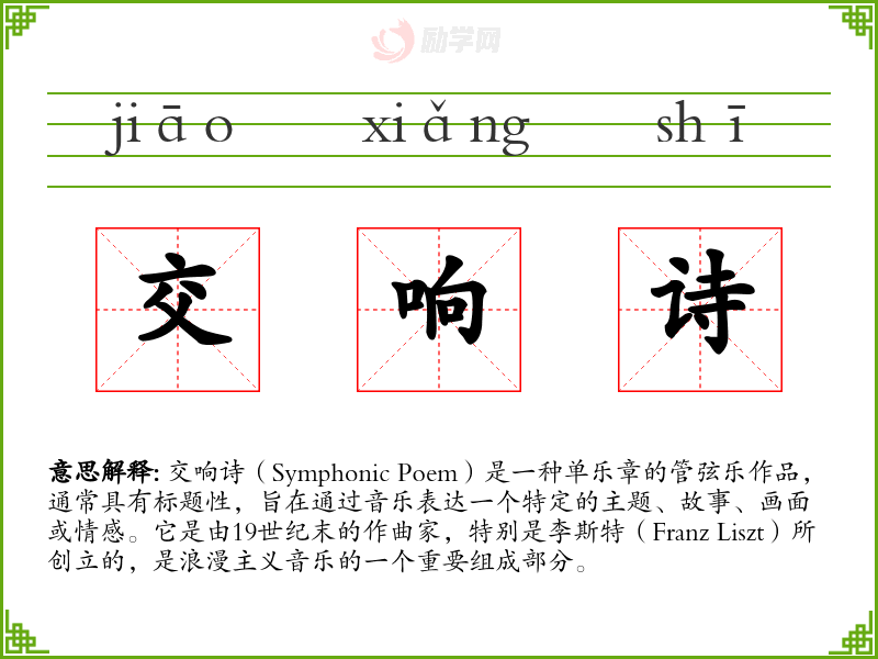 - 反义词:交响曲(symphony),通常指的是多乐章的管弦乐作品,与交响诗的单乐章形式相对。