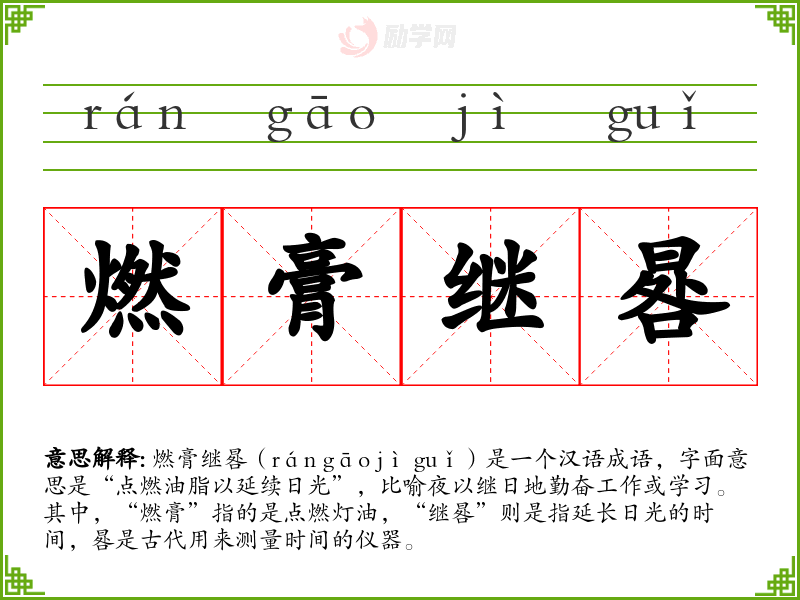 燃膏继晷(rán gāo jì guǐ)是一个汉语成语,字面意思是“点燃油脂以延续日光”,比喻夜以继日地勤奋工作或学*。其中,“燃膏”指的是点燃灯油,“继晷”则是指延长日光的时间,晷是古代用来测量时间的仪器。