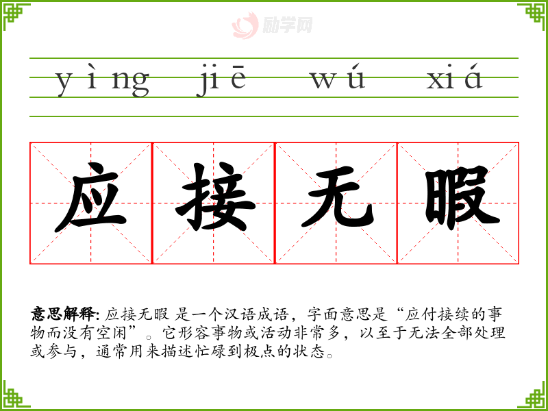 应接无暇 是一个汉语成语,字面意思是“应付接续的事物而没有空闲”。它形容事物或活动非常多,以至于无法全部处理或参与,通常用来描述忙碌到极点的状态。