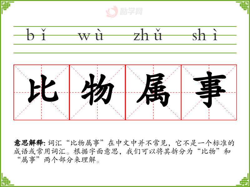 词汇“比物属事”在中文中并不常见,它不是一个标准的成语或常用词汇。根据字面意思,我们可以将其拆分为“比物”和“属事”两个部分来理解。