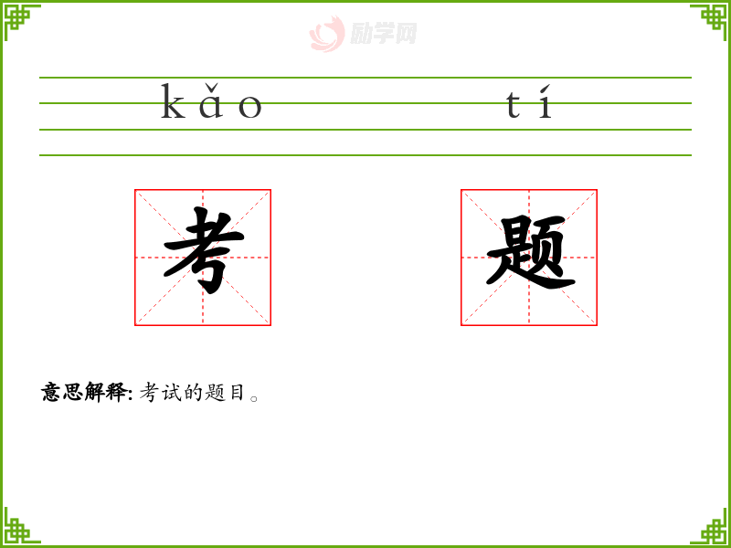 《说文》-题,额也。 《礼记·王制》-雕题交趾。 《汉书·司马相如传》-赤眉圆题。 《庄子·马蹄》。释文引司马崔云:“月题,马额上当颅如月形者也。”-夫加之以衡扼,齐之以月题。 《山海经·北山经》-文题白身,名曰孟极。 《楚辞·招魂》-雕题黑齿。 《后汉书·杜笃传》-连缓耳,琐雕题。