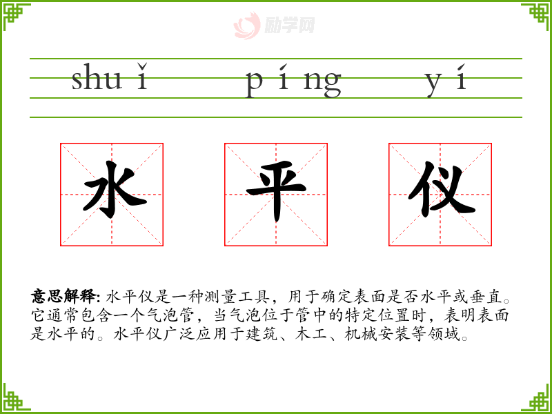 水平仪不仅是一个实用的工具,也是一个富有象征意义的词汇。它提醒我们在生活中追求精确和平衡,无论是在实际工作中还是在比喻意义上。了解和使用水平仪这个词,丰富了我的语言表达和理解能力。