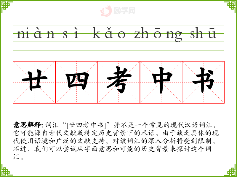 “廿四考中书”是一个具有特定历史和文化含义的词汇,它反映了古代科举制度对社会和文化的影响。虽然它在现代汉语中不常见,但在学*和研究古代历史时,了解这样的词汇有助于更深入地理解古代文化和制度。