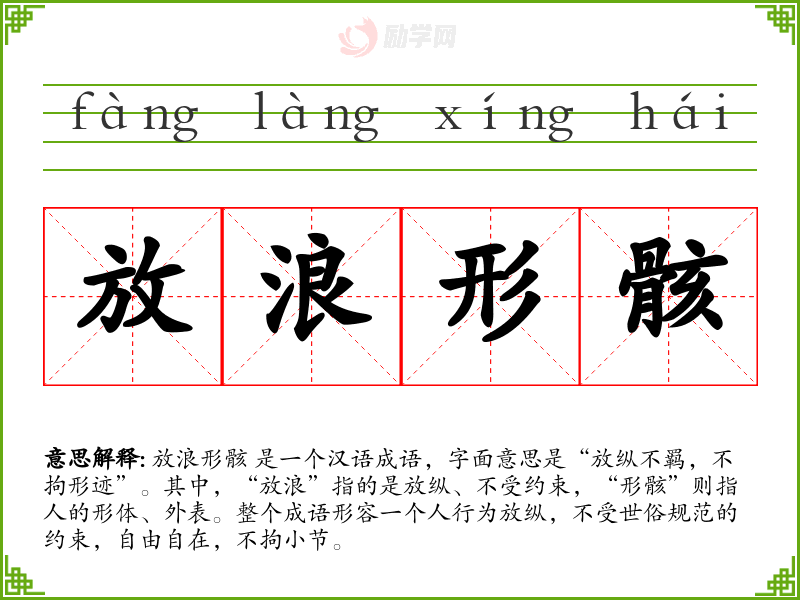 放浪形骸 是一个汉语成语,字面意思是“放纵不羁,不拘形迹”。其中,“放浪”指的是放纵、不受约束,“形骸”则指人的形体、外表。整个成语形容一个人行为放纵,不受世俗规范的约束,自由自在,不拘小节。