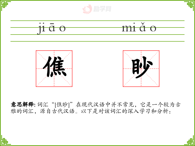 词汇“[僬眇]”在现代汉语中并不常见,它是一个较为古雅的词汇,源自古代汉语。以下是对该词汇的深入学习和分析: