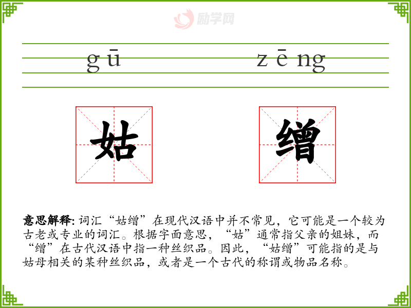 - 理解:“姑缯”是一个具有特定历史和文化背景的词汇,虽然在现代不常用,但在研究古代文化和历史时具有一定的价值。