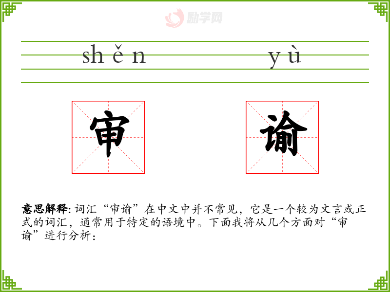 词汇“审谕”在中文中并不常见,它是一个较为文言或正式的词汇,通常用于特定的语境中。下面我将从几个方面对“审谕”进行分析: