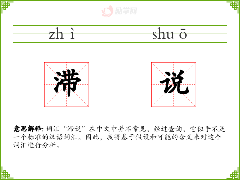 词汇“滞说”在中文中并不常见,经过查询,它似乎不是一个标准的汉语词汇。因此,我将基于假设和可能的含义来对这个词汇进行分析。