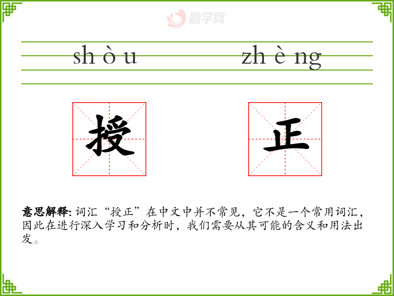 词汇“授正”在中文中并不常见,它不是一个常用词汇,因此在进行深入学*和分析时,我们需要从其可能的含义和用法出发。