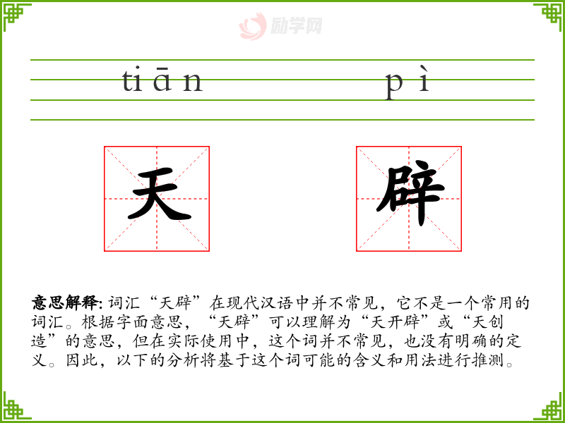 - 反义词:无(由于“天辟”不是一个常用词汇,反义词不明确)