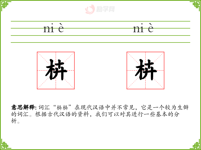 词汇“枿枿”在现代汉语中并不常见,它是一个较为生僻的词汇。根据古代汉语的资料,我们可以对其进行一些基本的分析。