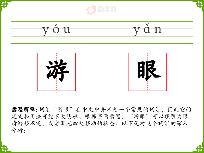 “游眼”字面意思是指眼睛不固定在一个点上,而是四处游移。它可以形容一个人在观察或思考时目光不集中,或者在社交场合中目光游离不定。