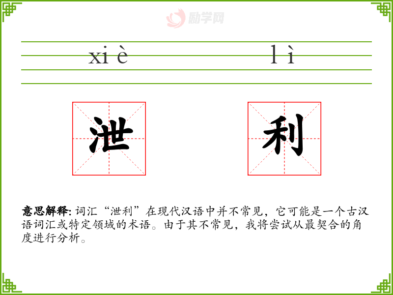 词汇“泄利”在现代汉语中并不常见,它可能是一个古汉语词汇或特定领域的术语。由于其不常见,我将尝试从最契合的角度进行分析。