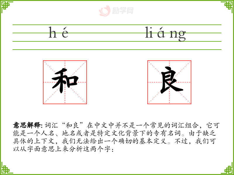 词汇“和良”在中文中并不是一个常见的词汇组合,它可能是一个人名、地名或者是特定文化背景下的专有名词。由于缺乏具体的上下文,我们无法给出一个确切的基本定义。不过,我们可以从字面意思上来分析这两个字: