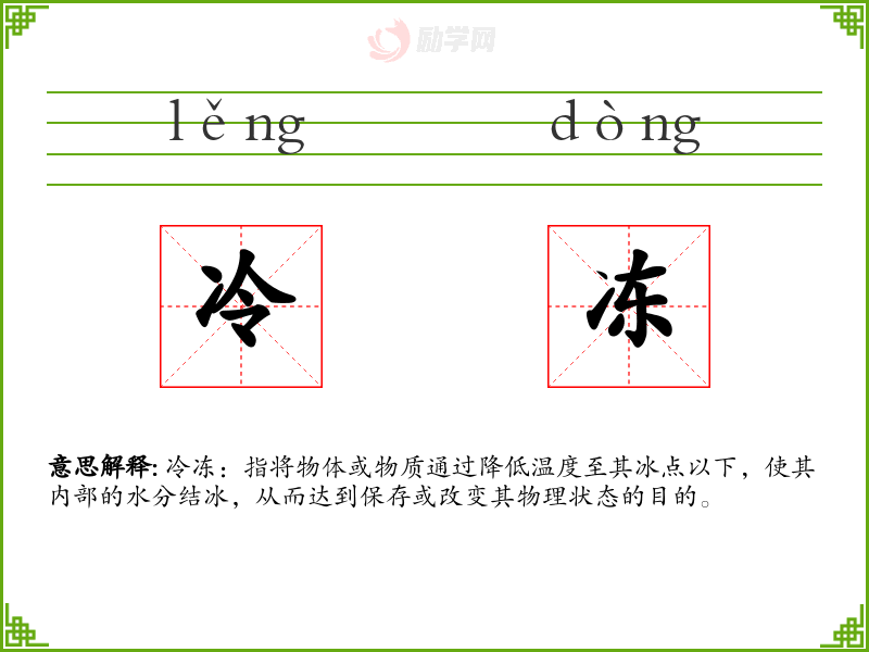 冷冻的意思是:降低温度使肉、鱼等所含的水分凝固~设备ㄧ把鲜菜~起来。