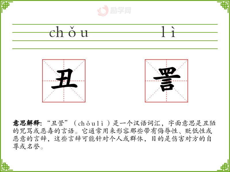 “丑詈”(chǒu lì)是一个汉语词汇,字面意思是丑陋的咒骂或恶毒的言语。它通常用来形容那些带有侮辱性、贬低性或恶意的言辞,这些言辞可能针对个人或群体,目的是伤害对方的自尊或名誉。