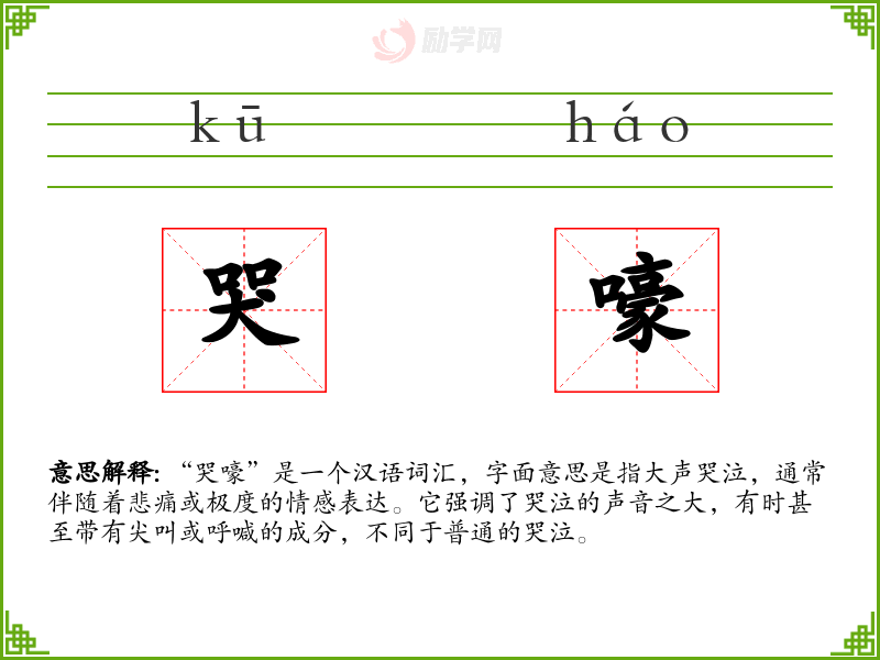“哭嚎”由“哭”和“嚎”两个字组成,“哭”字古已有之,表示哭泣;“嚎”字则有呼喊、大声叫的意思。两者结合,强调了哭泣的声音和强度。在古代文献中,如《诗经》中已有“哭”的使用,而“嚎”则更多出现在后来的文献中。