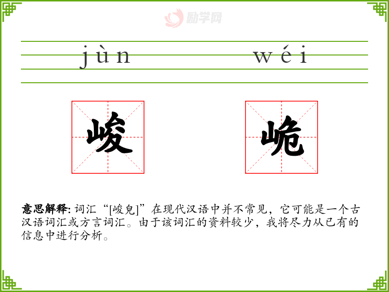 词汇“[峻皃]”在现代汉语中并不常见,它可能是一个古汉语词汇或方言词汇。由于该词汇的资料较少,我将尽力从已有的信息中进行分析。