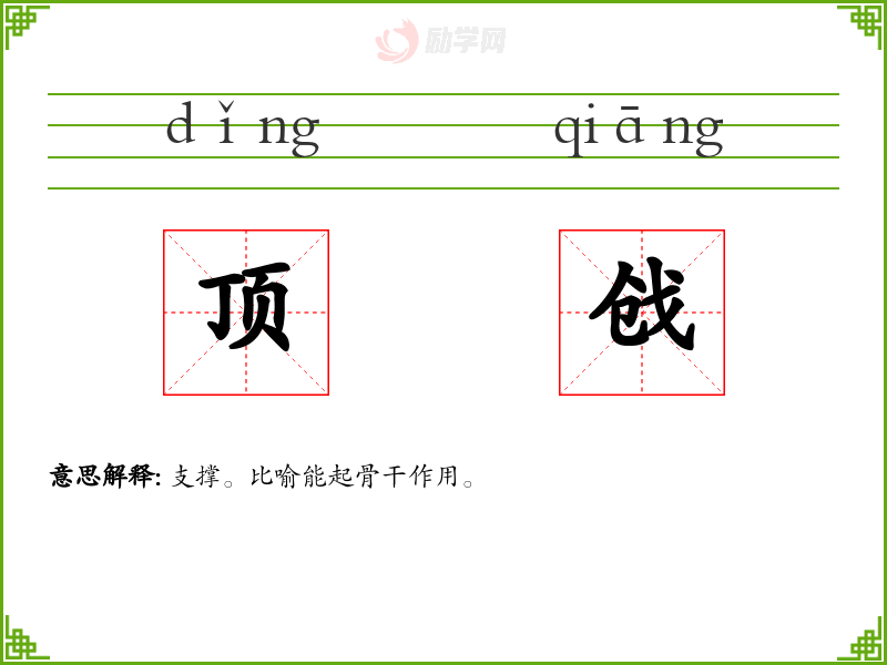 顶戗的意思是:支撑。比喻能起骨干作用。