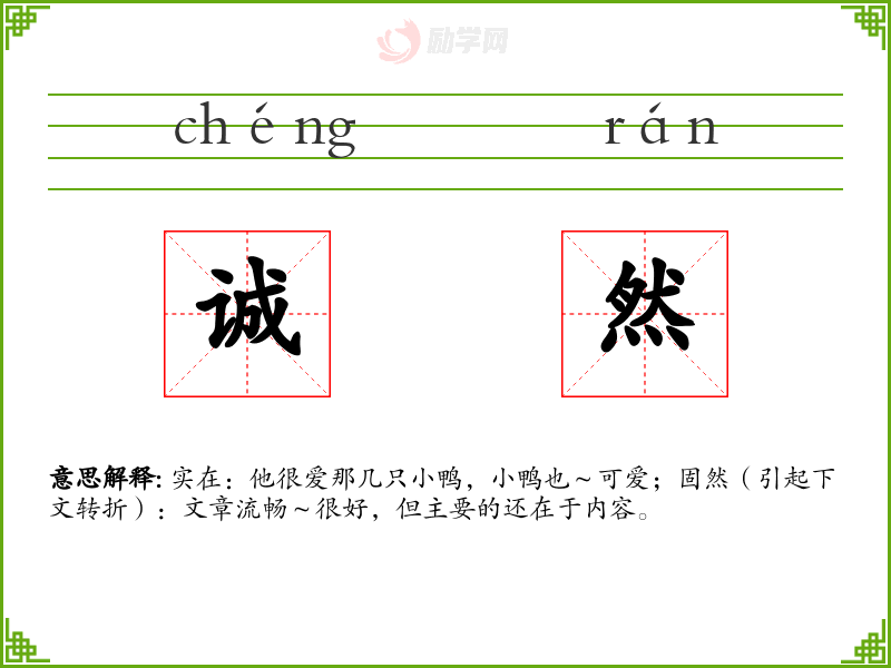 诚然的意思是:实在:他很爱那几只小鸭,小鸭也~可爱;固然(引起下文转折):文章流畅~很好,但主要的还在于内容。