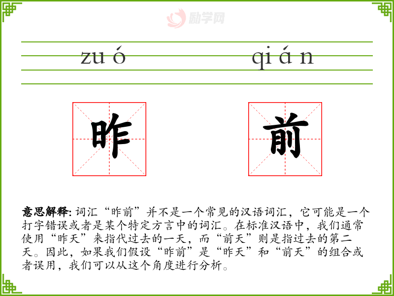 - 对该词汇的理解:“昨前”可能是一个打字错误或者是某个特定方言中的词汇,在标准汉语中并不存在。