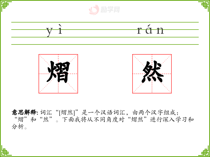 词汇“[熠然]”是一个汉语词汇,由两个汉字组成:“熠”和“然”。下面我将从不同角度对“熠然”进行深入学*和分析。
