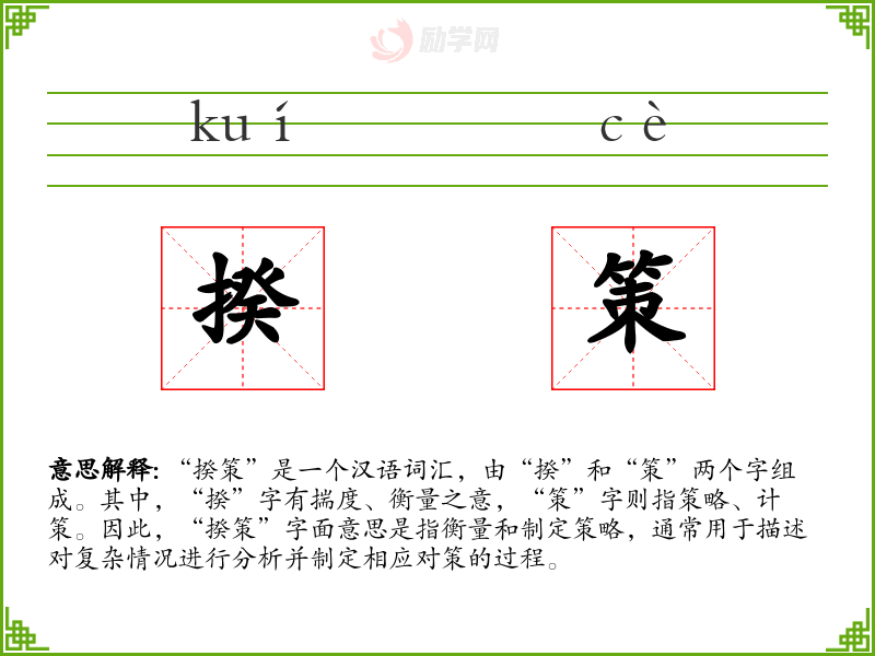 在视觉上,“揆策”可以联想到一张复杂的地图或战略图,上面布满了各种标记和线条,代表着各种可能的策略和路径。在听觉上,它可能让人联想到沉稳的讨论声或战略会议中的决策声音。