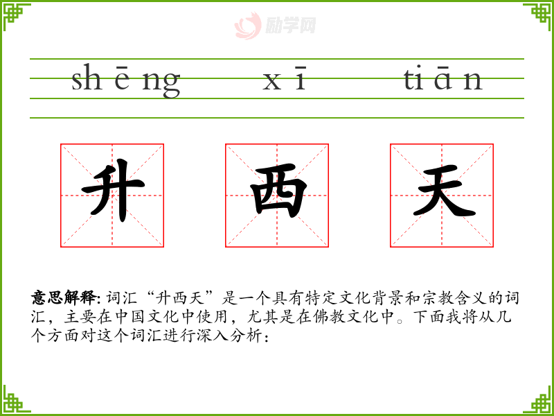 词汇“升西天”是一个具有特定文化背景和含义的词汇,主要在文化中使用,尤其是在**文化中。下面我将从几个方面对这个词汇进行深入分析: