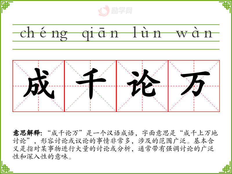 在文学作品中,“成千论万”常用来形容对某一主题或的深入探讨,如历史小说中对某一重大的分析。在口语中,这个成语可以用来形容人们在日常生活中对某一话题的热烈讨论。在专业领域,如学术研究或政策讨论中,这个成语可以用来描述对某一复杂问题的多角度分析。