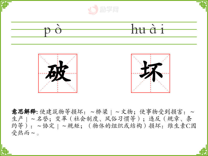 《说文》。按,当训毁也。-坏,败也。 《尔雅·释诂》-坏,毁也。 《史记·秦始皇本纪》。正义:“坼也,自颓曰坏。”-坠坏城郭。 《左传·文公十三年》-大室之屋坏。 《论衡·佚文》-恭公坏孔子宅以为宫。 《韩非子·说难》-天雨墙坏。 《吕氏春秋·察今》-而坏都舍。 明·归有光《项脊轩志》-室坏不修。