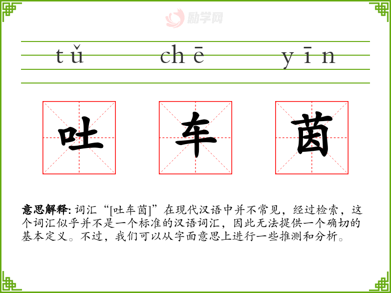 词汇“[吐车茵]”在现代汉语中并不常见,经过检索,这个词汇似乎并不是一个标准的汉语词汇,因此无法提供一个确切的基本定义。不过,我们可以从字面意思上进行一些推测和分析。