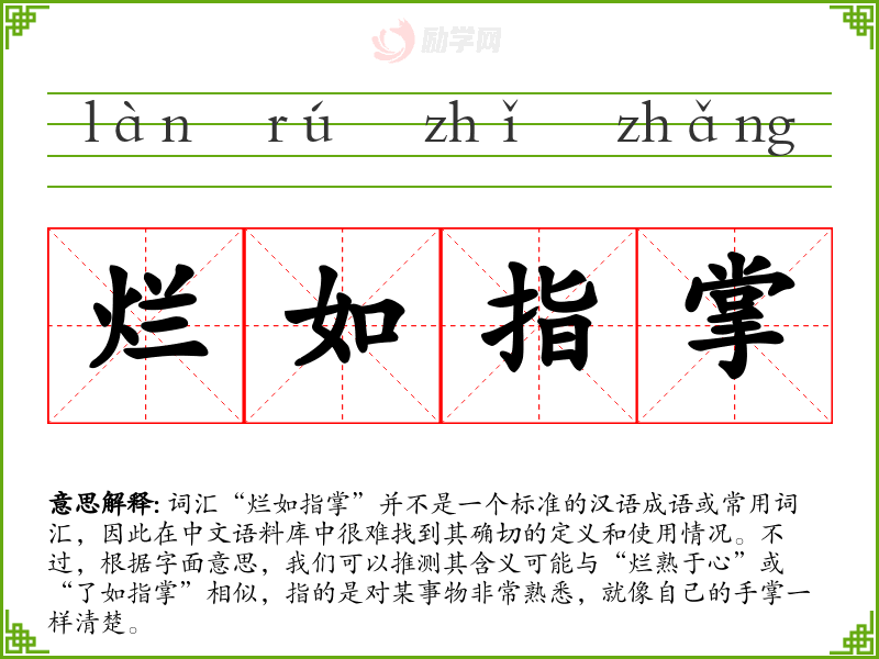 词汇“烂如指掌”并不是一个标准的汉语成语或常用词汇,因此在中文语料库中很难找到其确切的定义和使用情况。不过,根据字面意思,我们可以推测其含义可能与“烂熟于心”或“了如指掌”相似,指的是对某事物非常熟悉,就像自己的手掌一样清楚。