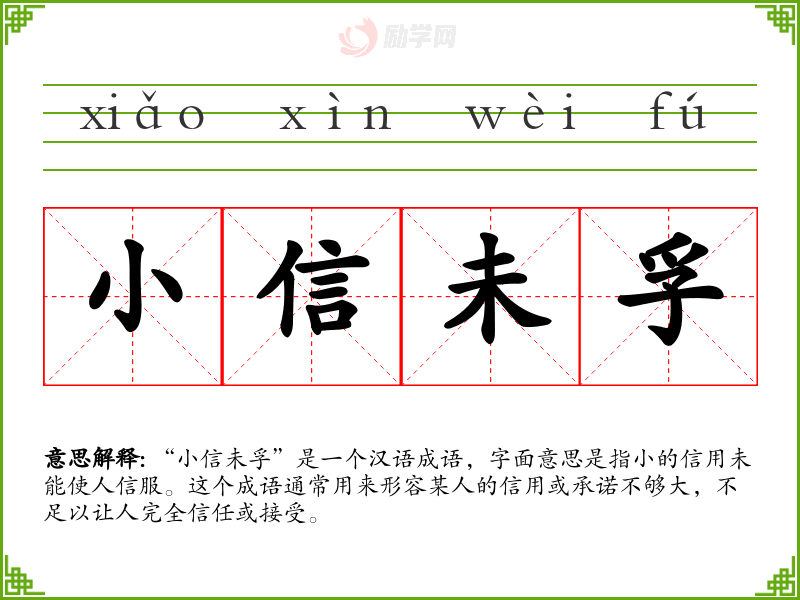 “小信未孚”是一个汉语成语,字面意思是指小的信用未能使人信服。这个成语通常用来形容某人的信用或承诺不够大,不足以让人完全信任或接受。