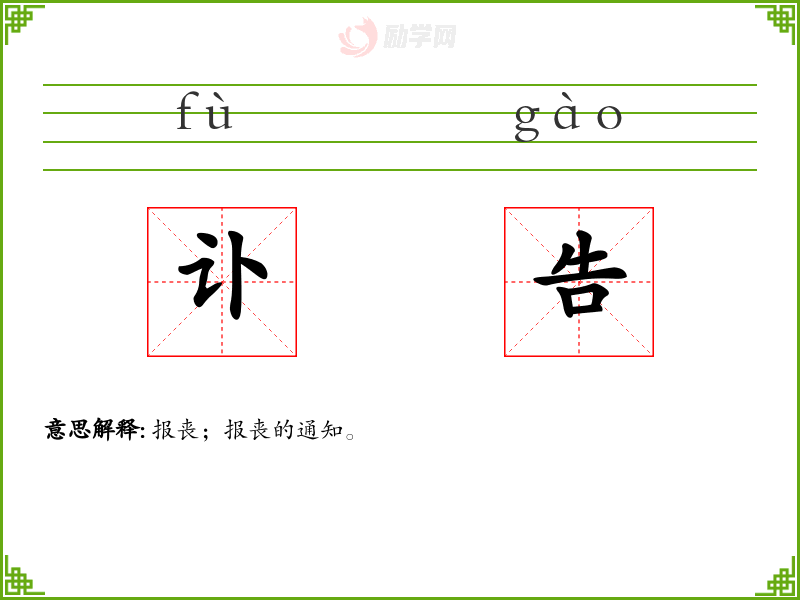 (形声。从言,卜声。 本义:报丧 。通告某人逝世的消息) 同本义。