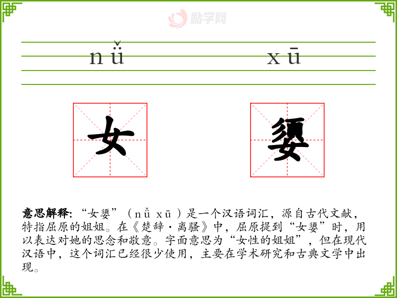 “女嬃”(nǚ xū)是一个汉语词汇,源自古代文献,特指屈原的姐姐。在《楚辞·离骚》中,屈原提到“女嬃”时,用以表达对她的思念和敬意。字面意思为“女性的姐姐”,但在现代汉语中,这个词汇已经很少使用,主要在学术研究和古典文学中出现。