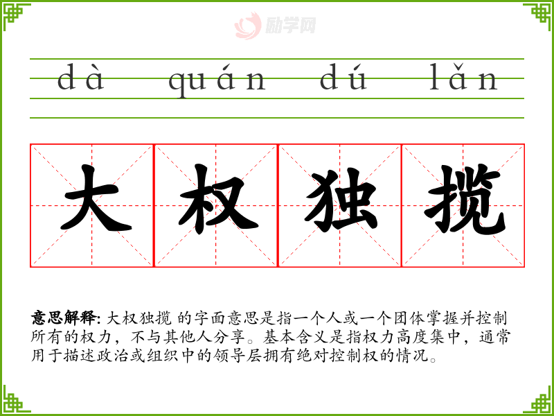 大权独揽 的字面意思是指一个人或一个团体掌握并控制所有的权力,不与其他人分享。基本含义是指权力高度集中,通常用于描述政治或组织中的领导层拥有绝对控制权的情况。
